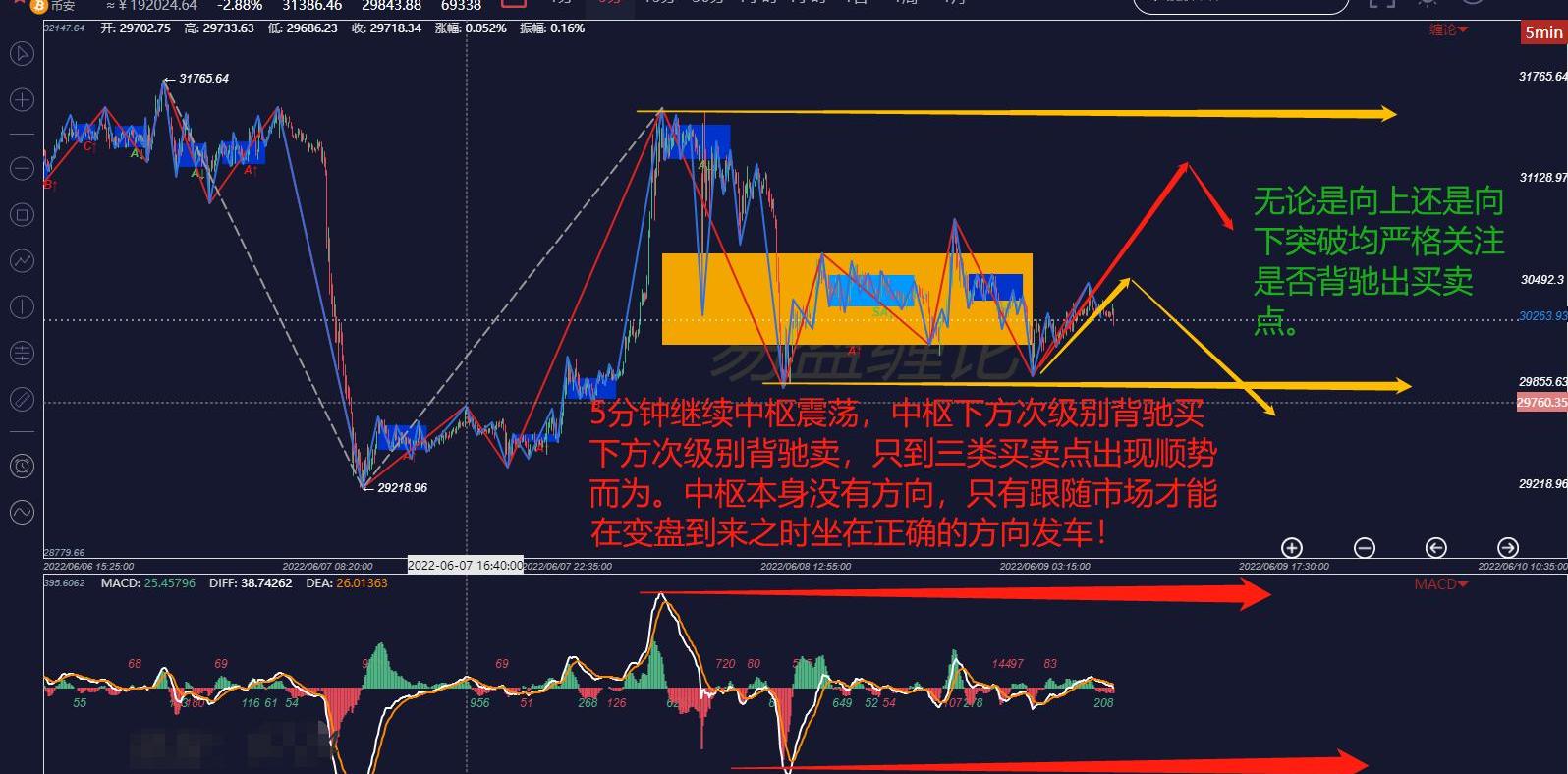 日内短线5分钟图以中枢为坐标去交易和跟随,所有大的波动最先展现出来的都是在小级别里,小级别完成的走势去构造大级别里的一段。想要抓住变盘节点的正确方向5分钟级别的跟随是最优的方案。如果出现5分钟三类买卖点顺势而为!