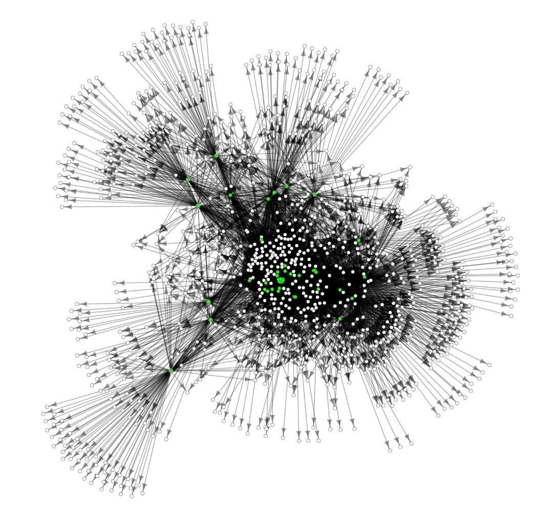 Gitcoin第13轮资助分布,来自他们的公告页面Gitcoin刚刚完成了他们的第13轮资助,其中包括与web3相关的项目,社会和社区倡议,以及慈善活动。这里的数据集将这些捐赠折叠到单一的Gitcoin钱包中。但我们可以将这些条目分解成各自的Gitcoin捐款。我们可以通过Etherscan的API中的input字段来推断哪些赠款得到了资助。通过这样做可以发现一些惊人的贡献。例如,一个用户在一次交易中捐赠了451个Gitcoin项目,每个项目分享2.85美元的DAI。Gitcoin的联合创始人KevinOwocki在这笔交易中向50多个项目进行了捐赠。为了了解这些捐赠的情况,让我们把前50个这样的捐赠,绘制在一个网络上。绿色的点是捐赠者,而开放的点是他们捐赠的项目。