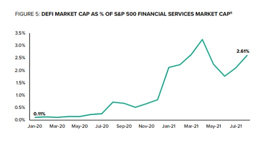 DeFi正在迅速达到一个临界点,新生的协议生态系统开始与现有的金融服务竞争。值得注意的是DeFi令人叹为观止的增长速度,DeFi的资产现在的价值占标准普尔500指数金融服务部门4.2万亿美元市值的2.6%以上,在不到两年的时间里上升了25倍。
