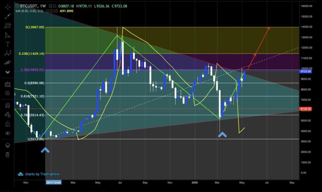 在以上图表中,比特币在出现小幅回调之前,刚刚突破了上升三角形区域。然后,BTC没有跌破0.382斐波那契水平线,转而上攻0.786斐波那契水平线。之前的研报指出,如果BTC的每日收盘价高于0.786斐波拉契回撤位,则比特币可能在看涨的情况下上攻10,000美元区域。上一份研报的质量如何研报发布后,BTC的每日收盘价高于0.786斐波那契水平。然后BTC在达到主要阻力位之前,继续上攻10,000美元的区域。与研报发布时相比增长了15%。BTC随后从10,000美元区域跌至8500美元的支撑位,跌破0.786斐波纳契回撤位。减半之后(红线表示),BTC再次升至0.786区域上方,随后空头无法将BTC进一步压低。目前价格在10,000美元区域附近,多头和空头之间发生了明显的缠斗。比特币长期价格愿景价格走势看涨目前,就长期价格愿景而言,比特币正处于关键时刻。它目前处于对称三角形区域的外部,似乎在测试向上的阻力,如下图所示: