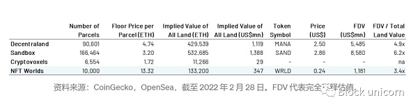 尽管最近对 NFT Worlds 进行了大肆宣传,但其土地的隐含价值和 WLRD 代币的完全稀释估值仍然比前两个加密原生开放世界平台低几个数量级。