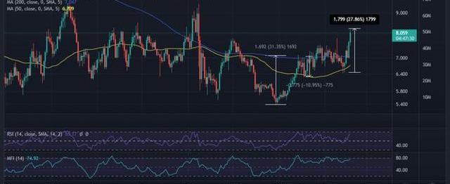 由于持续上涨,LINK的MACD已越过信号线上方。LINK可能会在未来几天超过8.20美元的阻力位。然而,在继续反弹之前,可能会出现小幅回调。