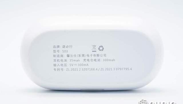 充电盒底部印有产品信息,品牌:诺必行,型号:S03,制造商:馨兰仕电子有限公司,耳机电池:35mah,充电仓电池:300mah,输入电压:5V-300mA,以及专利号等。