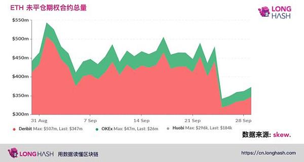 根据 Skew 的数据,自 9 月 1 日以来,以太坊期权未平仓合约已经从 5.44 亿美元缩水到约 3.62 亿美元。